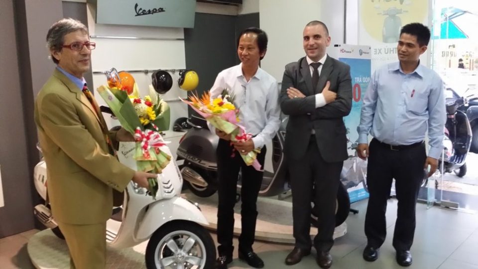 Nella foto Enzo Falcone, presidente di Care the People, assieme agli organizzatori dell’asta ed al rappresentante di Piaggio Vietnam durante la Cerimonia di Consegna della Vespa.